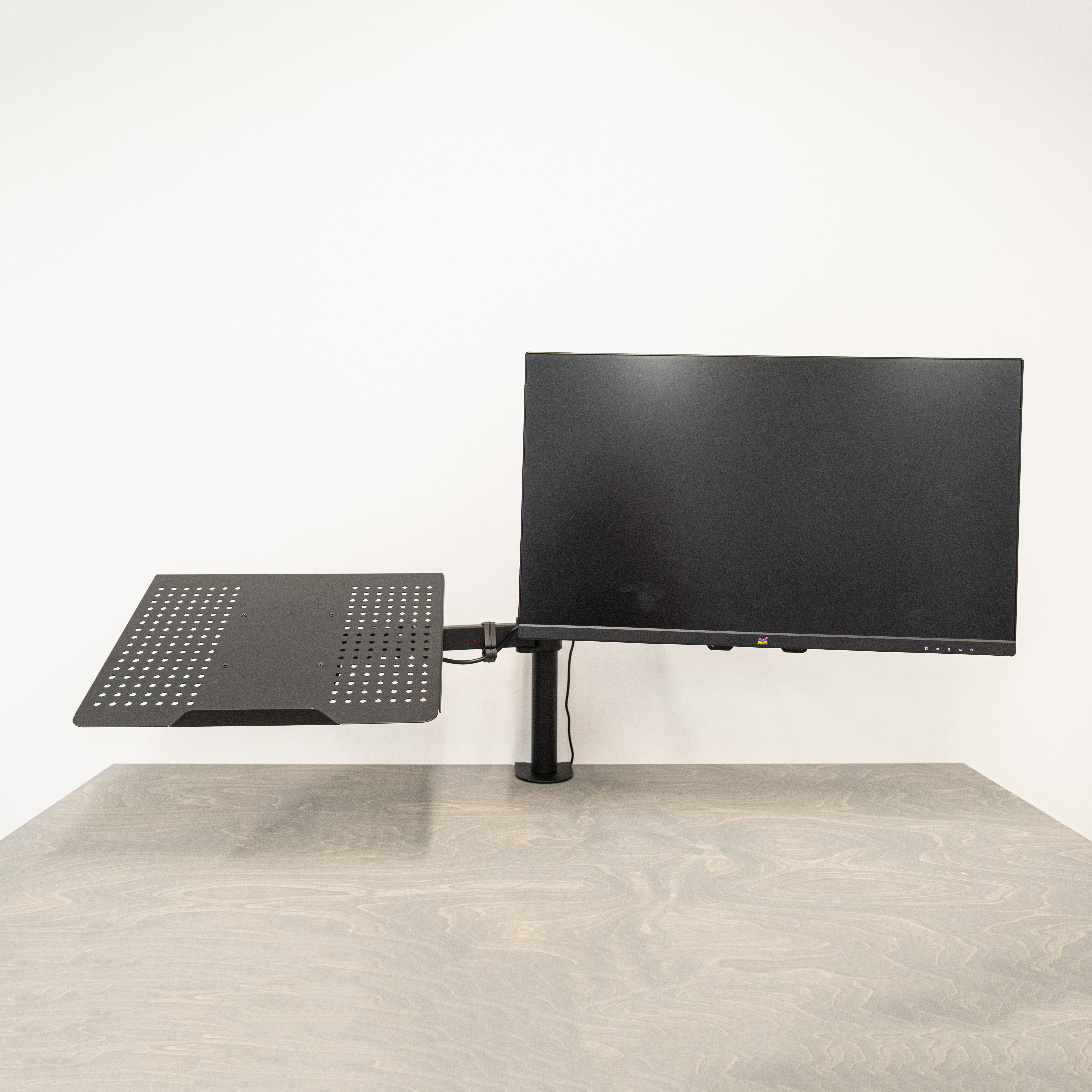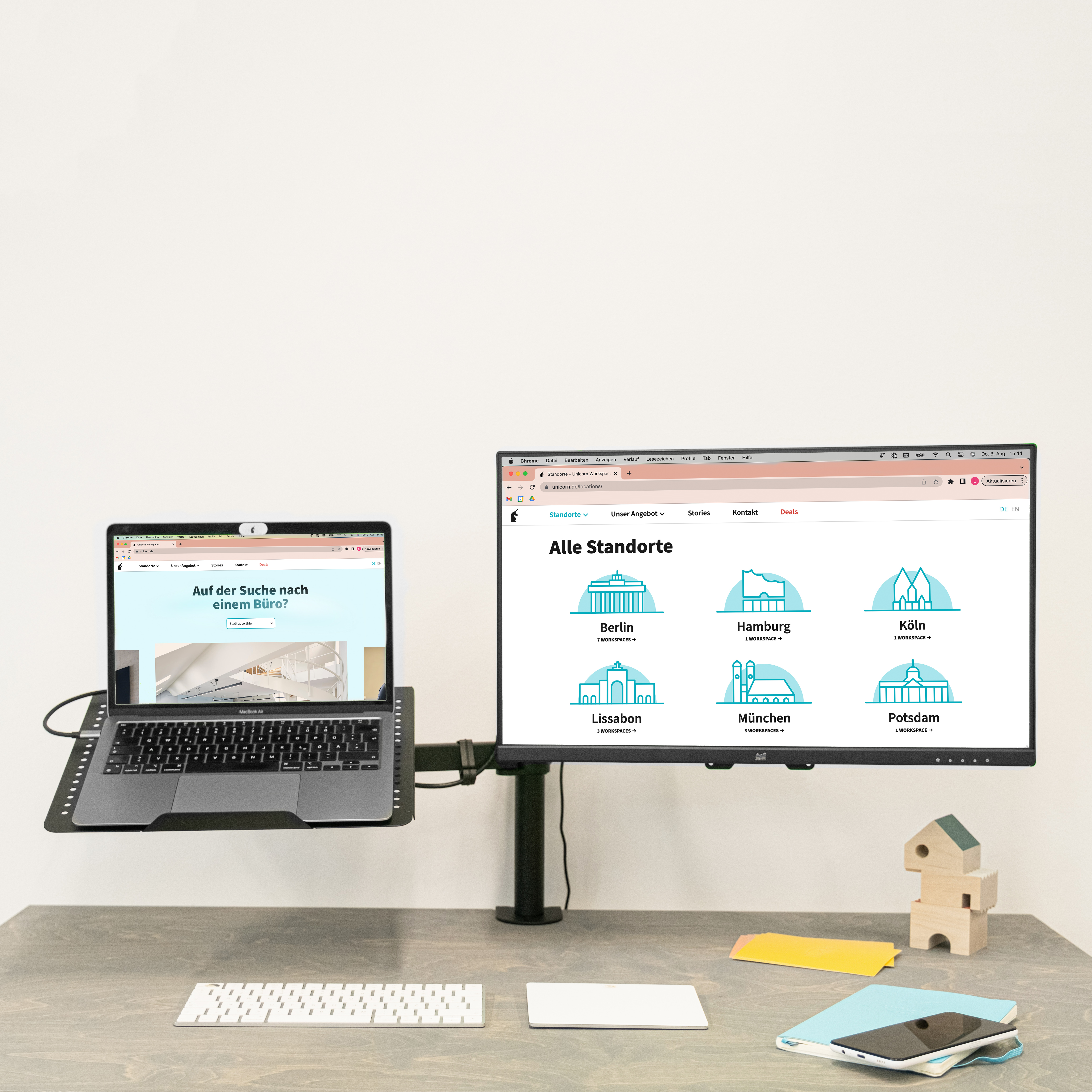 Schafft mehr Platz auf Eurem Schreibtisch mit unserer praktischen Laptophalterung, die auch den Monitor in idealer Position hält.