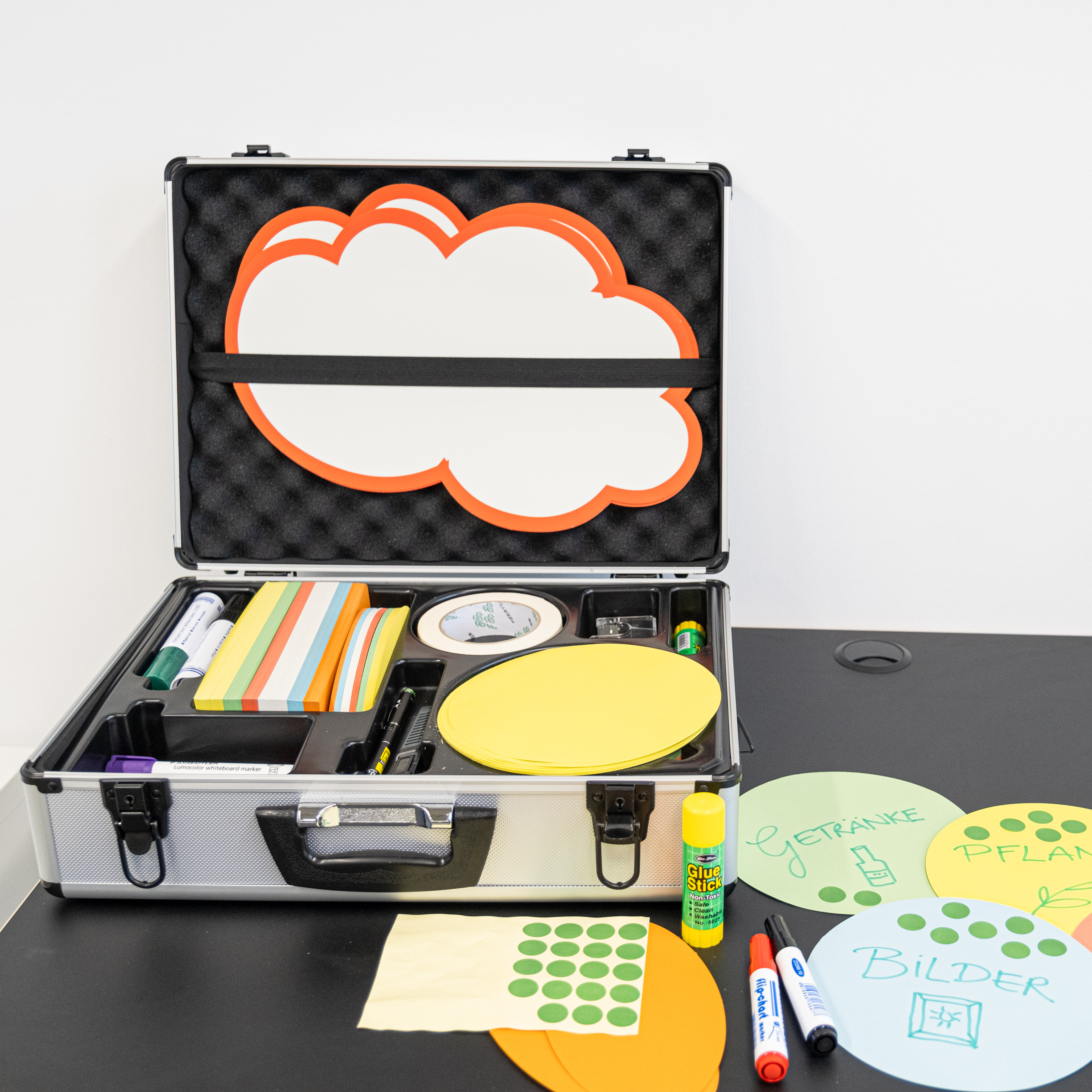 Für produktive Meetings und Präsentationen: Unser Moderationskoffer enthält alle notwendigen Tools für eine gelungene Zusammenarbeit. (Abbildung ähnlich)